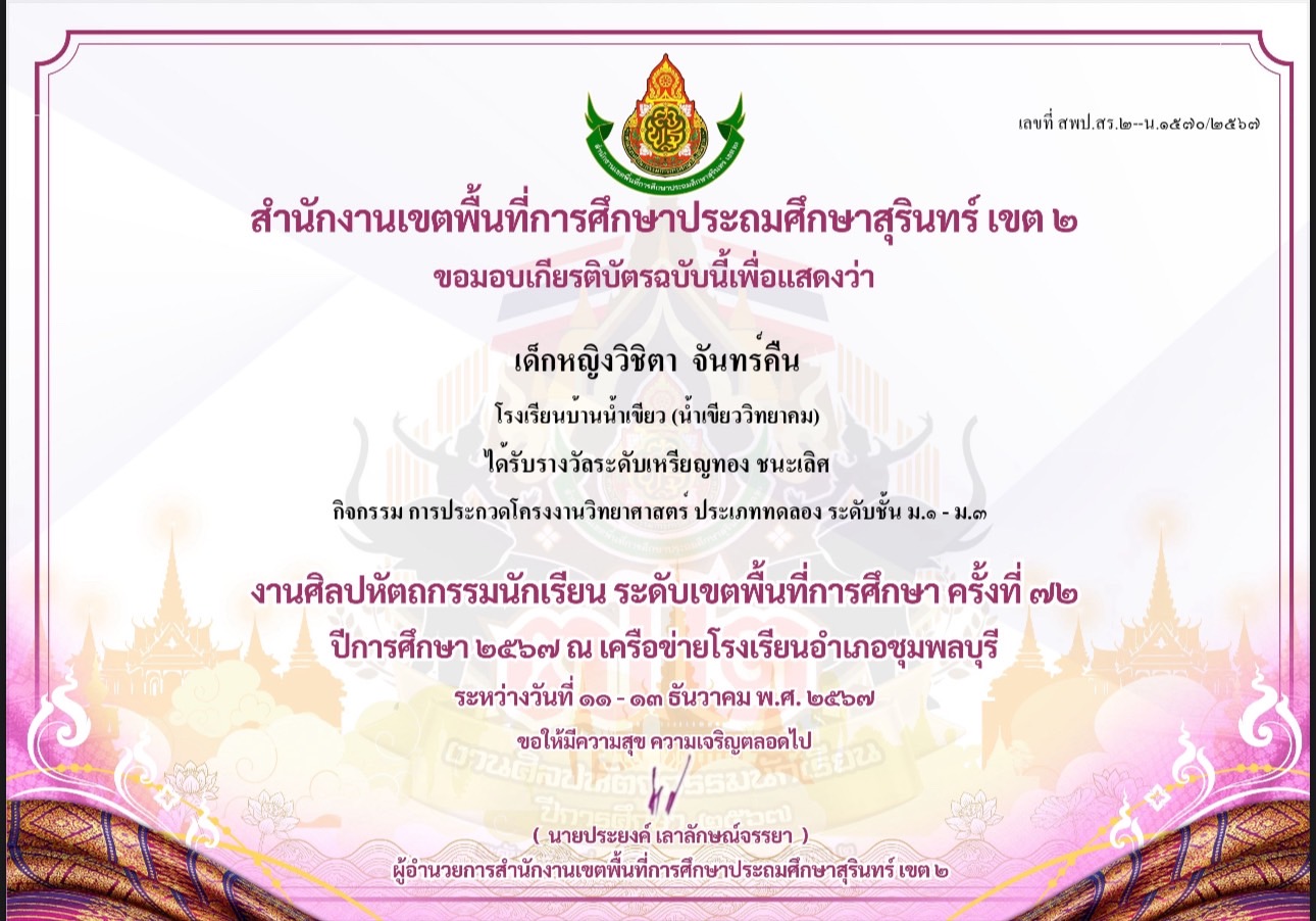รางวัลระดับเหรียญทอง ชนะเลิศ กิจกรรมการประกวดโครงงานวิทยาศาสตร์ ประเภททดลอง ระดับชั้น ม.1-3 งานศิลปหัตถกรรมนักเรียนครั้งที่ 72