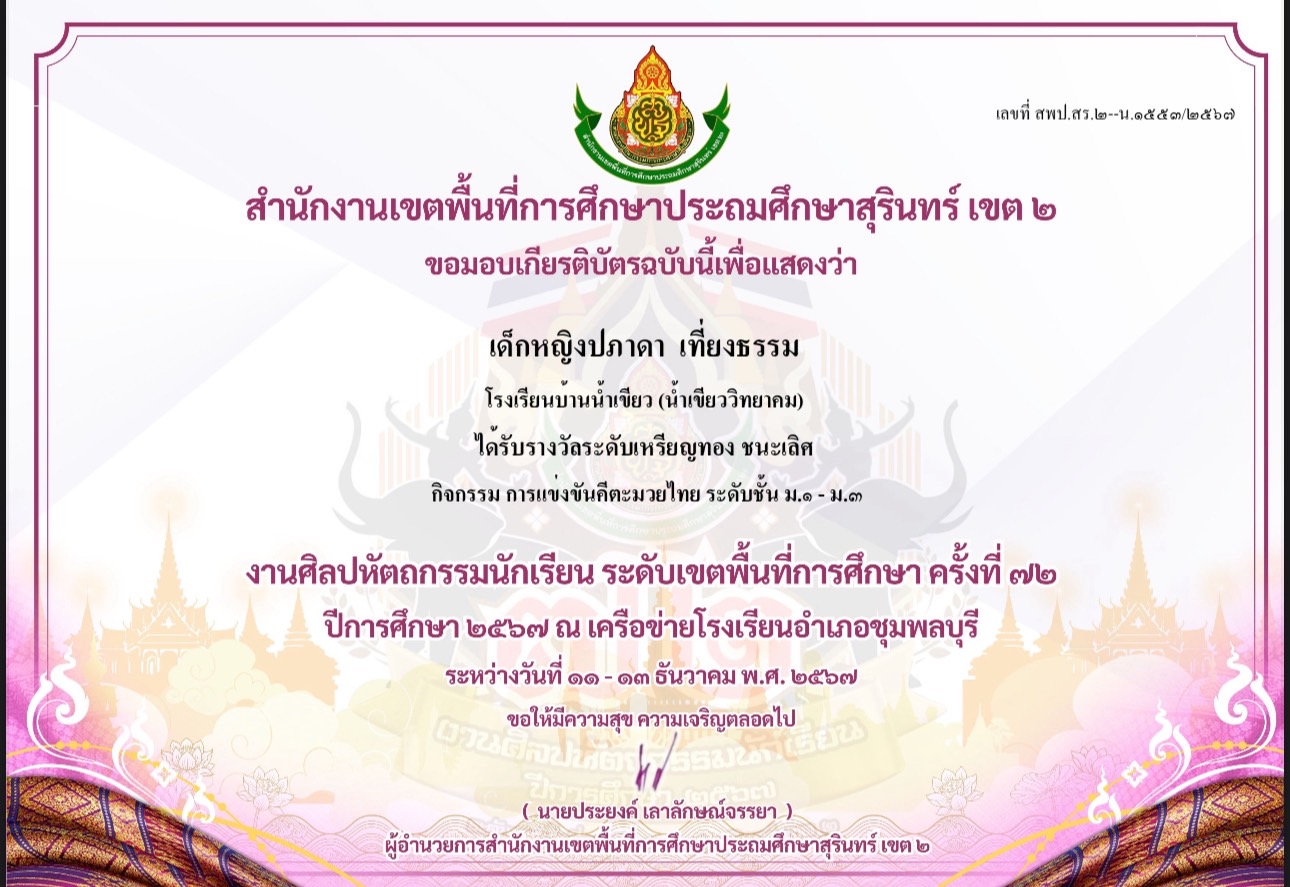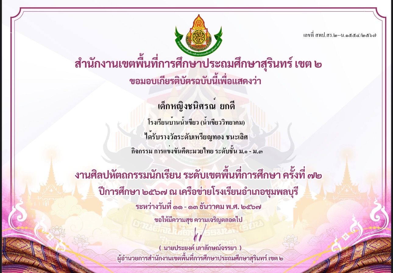 รางวัลระดับเหรียญทอง ชนะเลิศ กิจกรรมการแข่งขันคีตะมวยไทย ระดับชั้น ม.1-3 งานศิลปหัตถกรรมนักเรียนครั้งที่ 72