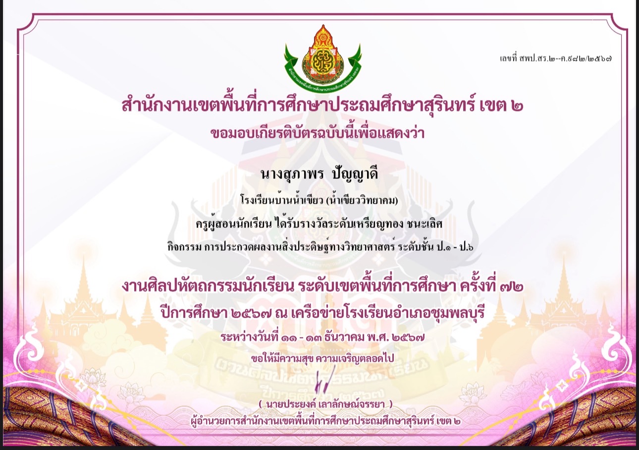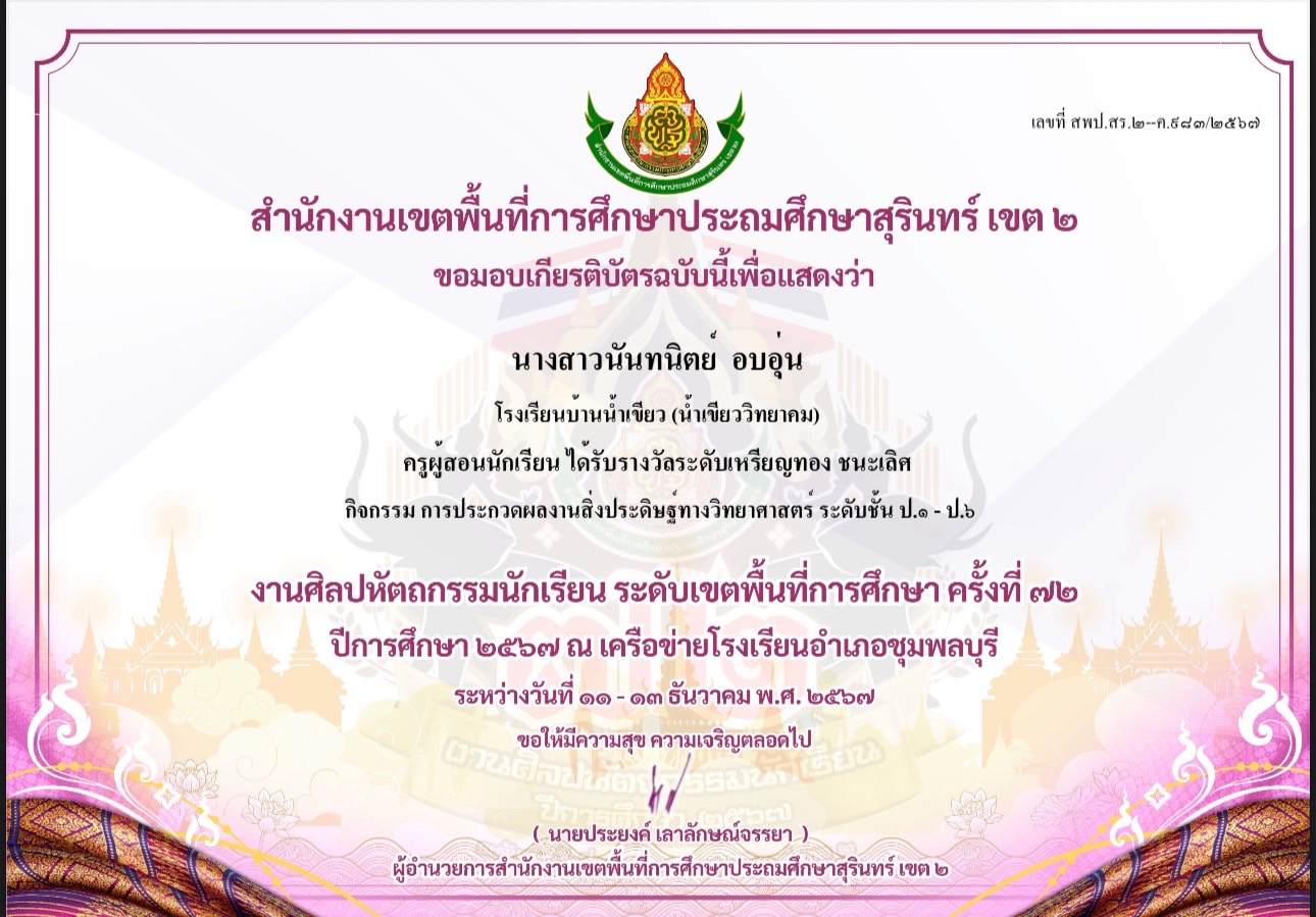 ครูผู้สอนนักเรียนได้รับรางวัลระดับเหรียญทอง ชนะเลิศ กิจกรรมการประกวดผลงานสิ่งประดิษฐ์ทางวิทยาศาสตร์ ระดับชั้น ป.1 -6 งานศิลปหัตถกรรมนักเรียนครั้งที่ 72